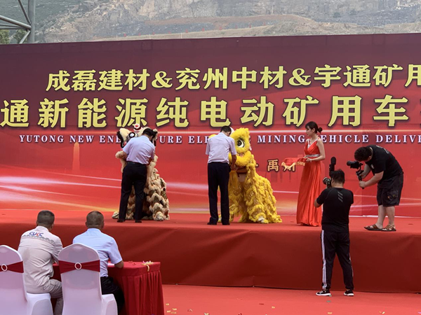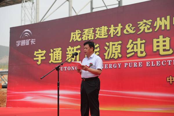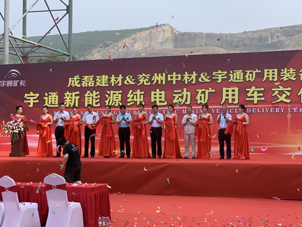 儀式現(xiàn)場(chǎng)彩旗飄飄,人聲鼎沸,場(chǎng)面氣氛熱烈而隆重。首先,宇通礦用裝備銷(xiāo)售公司總經(jīng)理馬勇先生致詞,馬總介紹了宇通客車(chē)響應(yīng)國(guó)家政策在新能源礦車(chē)領(lǐng)域擁有的先進(jìn)技術(shù)和取得的市場(chǎng)成就,以及對(duì)兗州中材建設(shè)有限公司、禹州市成磊建材有限公司美好明天的祝福。隨后,兗州中材建設(shè)有限公司副總經(jīng)理顏景祥先生上臺(tái)致詞,顏總強(qiáng)調(diào),兗州中材建設(shè)有限公司作為中央企業(yè)是更具有社會(huì)責(zé)任感的企業(yè),兗州中材在謀求發(fā)展的同時(shí)積極貫徹國(guó)家政策,在礦山施工中率先使用新能源設(shè)備,為構(gòu)建“資源節(jié)約型、環(huán)境友好型”社會(huì)做出應(yīng)有的貢獻(xiàn),承擔(dān)央企責(zé)任,擔(dān)負(fù)央企職責(zé)。最后,禹州市成磊建材有限公司總經(jīng)理張景奇先生致詞,張總肯定了兗州中材建設(shè)有限公司在礦山施工中采用更加安全環(huán)保新型設(shè)備的工作,期望兗州中材建設(shè)有限公司依靠過(guò)硬的施工技藝、新型的生產(chǎn)設(shè)備、高效的管理模式將禹州市成磊建材有限公司礦山在全省乃至全國(guó)范圍內(nèi)樹(shù)立標(biāo)桿,打造成示范性礦山。
