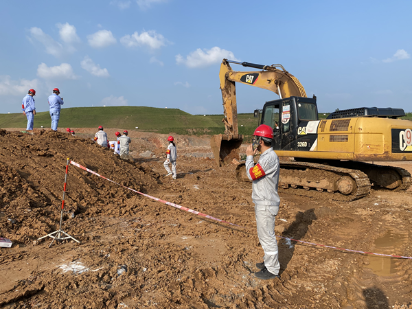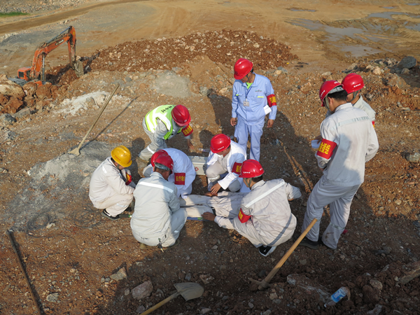 演練模擬礦山施工作業(yè)面35平臺進行爆破作業(yè),由于炮孔充填深度不夠,導(dǎo)致沖孔現(xiàn)象,產(chǎn)生飛石,現(xiàn)場管理人員在礦區(qū)北側(cè)警戒時,被爆破飛石砸中,導(dǎo)致腿部受傷,傷勢嚴重。總指揮在接到救援電話后,立即啟動三級應(yīng)急預(yù)案,通知辦公室、各應(yīng)急小組就位。礦山應(yīng)急救援隊員攜帶專業(yè)救援裝備,駕駛應(yīng)急救援車,拉警報,火速趕赴事故現(xiàn)場。到達現(xiàn)場后,立即判斷受傷人員傷情,及時救出并進行止血包扎、固定等簡單處理后由救援隊員用擔(dān)架抬上120救護車,并送往就近醫(yī)院救治。演練過程中各應(yīng)急小組各司其職、協(xié)同作戰(zhàn)、反應(yīng)迅速,整個演練過程在快速、緊張、有序的氛圍中進行,圓滿完成了各項預(yù)定任務(wù)。    此次放炮應(yīng)急預(yù)案演練貼近實戰(zhàn)、分工明確、行動迅速、救援工作有條不紊地執(zhí)行。既督促企業(yè)落實安全主體責(zé)任,指導(dǎo)提高員工的安全隱患意識和管理能力,確保了黃槽坊礦山的整體安全,又達到了檢驗礦山應(yīng)急救援小組的實戰(zhàn)和應(yīng)對突發(fā)事件的應(yīng)急處置能力的目的,更進一步檢驗了預(yù)案的可操作性和針對性,為今后突發(fā)生產(chǎn)安全事故下熟練完成救援任務(wù)打下了堅實的實戰(zhàn)基礎(chǔ)。