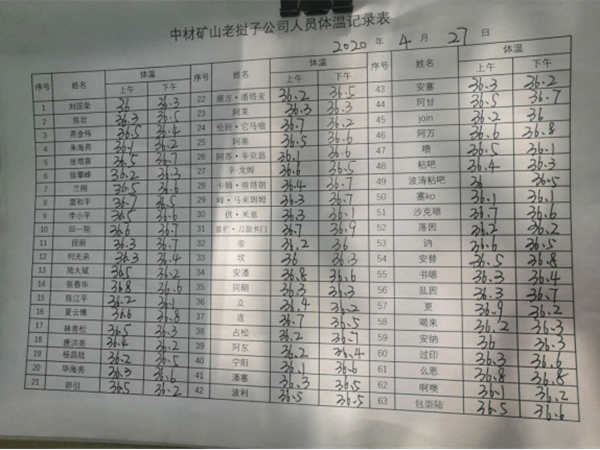 根據(jù)老撾衛(wèi)生部2020年4月28日下午2點半的數(shù)據(jù)更新,老撾已經(jīng)連續(xù)16日未出現(xiàn)新的新冠病例,從1月份到4月28日,累計檢測1815例,累計排除1796例,累計確診19例,累計治愈出院7例,現(xiàn)存12例,11例在萬象150友誼醫(yī)院,1例在瑯勃拉邦省醫(yī)院,均為輕微癥狀。 隨著新型冠狀肺炎在全球蔓延,疫情防控形勢異常嚴峻,老撾項目部按照公司統(tǒng)一部署,加強領(lǐng)導,高度重視,積極應對,采取有力措施,確保疫情防控和安全生產(chǎn)工作的順利進行。 一、成立疫情期間突發(fā)事件應急領(lǐng)導小組,建立健全安全防范工作機制,明確各小組成員職責劃分。 按照突發(fā)事件性質(zhì)、機理和發(fā)生過程分類為突發(fā)聚集性疫情、醫(yī)療防疫物資采購和運輸受限、境外項目醫(yī)療防疫物資和生活物資儲備不能滿足需要、醫(yī)療防疫物資和生活物資遭哄搶、中方員工或中外方員工之間發(fā)生群體性事件、項目營地遭恐怖襲擊、人員緊急撤離回國、其他如綁架劫持等八類事件。根據(jù)項目所在地疫情形勢、社會治安狀況、物資供應情況等外部條件以及突發(fā)事件的性質(zhì)、嚴重程度、可控性和影響范圍等因素,將項目疫情突發(fā)事件分為I級(特別重大)、II級(重大)、III級(較大)和IV級(一般)四個級別。并根據(jù)上述四個級別建立對應四級響應機制,建立相應應急預案并進行演練。 二、編制各項應急培訓 1.項目全員進行新冠病毒相關(guān)知識培訓,確保每人都能熟悉相關(guān)防疫知識。 2.防護措施、防護要領(lǐng)培訓,確保每名員工都能做好自身防護,并充分認識到做好自身防護的重要性。 3.特殊時期安保、安全意識再培訓,鞏固培訓。 4.進行各項專項應急預案演練工作。   開展培訓學習 三、采取各項預防措施 項目部本著“以人為本、預防為主、防治結(jié)合”的原則,牢固樹立“全員防疫”的思想意識。通過各種形式和途徑來宣傳疫情影響下可能帶來的突發(fā)事件及應對措施。 1.疫情預防 1.1實時掌控老撾和項目所在地的疫情增長情況,評估疫情風險。 1.2 疫情初期密切關(guān)注當?shù)厣鐣咔榘l(fā)展對物資供應所產(chǎn)生的影響,不等不靠,主動作為,利用各類資源多途徑多渠道籌措物資及時儲存足夠防疫、生活物資。 1.3 優(yōu)化各生產(chǎn)工種人員,精簡部分當?shù)貑T工、精簡一些非必要崗位且傳播風險高的當?shù)貑T工,如食堂幫工、項目駐地清潔工等。 1.4 優(yōu)化現(xiàn)場生產(chǎn)工作流程,減少或避免一些非必要的中方員工與當?shù)貑T工接觸交流情況。 1.5 給當?shù)貑T工配備口罩、護目鏡、手套等防護用品,上下班體溫監(jiān)測。 1.6 項目駐地、辦公場所、生產(chǎn)場所、生產(chǎn)生活車輛設(shè)備等每日定時定點消毒。 1.7 制定項目疫情防控規(guī)定,對防護物品佩戴、體溫測量、距離保持、聚餐等行為進行嚴格規(guī)范和要求。 1.8加強職工食堂、員工宿舍的衛(wèi)生管理,防止交叉感染。 1.9 當?shù)夭少彽纳a(chǎn)生活物資嚴格執(zhí)行開箱前送貨車輛消毒、開箱后貨物消毒、入庫后再消毒多次全方位消毒措施。   部分雙語宣傳頁   部分防疫物資  體溫記錄表 2.其他突發(fā)事件預防 2.1以適當?shù)那罍贤üこ膛従用耜P(guān)系。尊重當?shù)貑T工,平等相待,和睦共處;人員雇傭時,要兼顧所在地各社區(qū)利益,避免社區(qū)麻煩。項目駐地嚴格實行封閉管理制度,非上下班期間,禁止任何人員外出駐地。 2.2建立并保持與工程項目所在地政府機構(gòu)、治安機構(gòu)的聯(lián)系渠道。 2.3關(guān)注工程所在地和毗鄰地區(qū)社會治安動向。發(fā)現(xiàn)工地、駐地周邊有可疑情況,及時采取應對措施并向我國使(領(lǐng))館和當?shù)卣畧蟾妗?/p> 2.4 精簡當?shù)貑T工時,并就工資、勞工補償?shù)冗_成協(xié)議,避免當?shù)貑T工出現(xiàn)群體性事件。 2.5礦山增加夜間照明設(shè)備,安排人員24小時值班,防止偷盜、搶劫等。 2.6與員工開展談心活動,穩(wěn)定員工的思想和情緒;項目部領(lǐng)導和安全主管要定期或不定期與當?shù)毓蛦T、司機交流,了解其思想動態(tài),一旦發(fā)現(xiàn)有不好的苗頭,應立即采取措施。 2.7告誡司機無特殊情況上下班中途不準停車,不準搭載其他人乘車。要求司機定期檢查車輛狀況,發(fā)現(xiàn)問題及時報告處理,不允許車輛帶病行駛。 2.8完善生活區(qū)安防設(shè)施,增加攝像頭、夜間照明、加固圍欄鐵絲網(wǎng)。 2.9為境外人員購買合適的海外人身意外傷害保險。 四、應急社會資源及物資采取措施 1.建立并保持中國駐老撾大使館的溝通渠道。 2.建立并保持與項目部所在地的疾控中心、衛(wèi)生機構(gòu)、定點收治醫(yī)院的聯(lián)系渠道。 3.建立并保持與項目部所在地的政府、警局等治安防治機構(gòu)的聯(lián)系渠道。 4. 密切關(guān)注老撾境內(nèi)的疫情發(fā)展對醫(yī)療防疫物資所產(chǎn)生的影響,不等不靠,主動作為,利用各類資源多途徑多渠道籌措物資,及時充足充分儲存防疫物資。 5.對各類醫(yī)療防疫物資分類儲存,建立臺賬,加強領(lǐng)用管理,確保物資使用安全、高效、透明。對酒精、消毒劑單獨存放,避免發(fā)生火災。 6.項目駐地配置一定數(shù)量的隔離室,用于發(fā)燒疑似人員隔離檢測。 7.大米、面粉、肉類、調