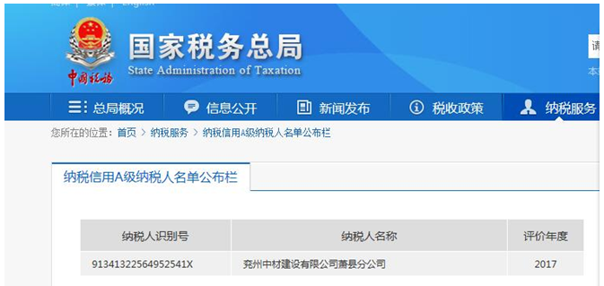 2018年6月15日,經(jīng)過在國家稅務(wù)總局官方網(wǎng)站查詢得知:兗州中材建設(shè)有限公司蕭縣分公司被評(píng)定為“A級(jí)納稅信用企業(yè)”。