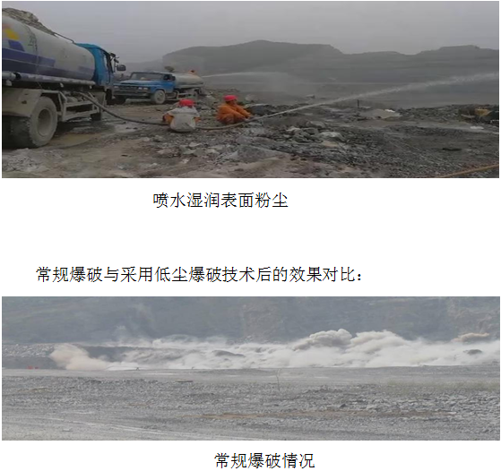 (5)、采用低塵爆破技術對于礦山爆破進行降塵作業(yè): 爆破粉塵的來源:一是爆破物體表面的粉塵,鉆孔產(chǎn)生的巖粉;二是爆破物體破碎產(chǎn)生的粉塵,爆破物體坍塌產(chǎn)生的粉塵,爆炸沖擊波和爆炸氣體揚起的粉塵。 爆破粉塵的危害:一是環(huán)境危害,主要包括大氣污染和生態(tài)系統(tǒng)的破壞,粉塵污染后的空氣通過大氣循環(huán)對周邊的城市空氣質(zhì)量造成嚴重影響;二是社會危害,對人體健康危害,引起塵肺病等。 目前,關于爆破降塵有多種不同的工藝,其中利用水袋進行低塵爆破技術的降塵是一種相對方便 水袋法降塵爆破主要依據(jù)炸藥爆炸使水袋中的水形成水霧霧滴,水霧霧滴都是有一定大小,水霧水滴對爆破粉塵進行捕捉而濕潤塵粒,達到降塵效果。 根據(jù)水霧霧滴與粉塵作用原理,水霧霧滴對粉塵的作用時間越長越好,因此應設定水袋受爆炸沖擊波影響一定的時間間隔,使水霧霧滴與粉塵具有較長的作用時間。為加強除塵效果,單個炮孔的周圍不會只設置1個水袋,因此還要確定不同布置位置水袋起爆時間。 以上單水袋、雙水袋的設置位置是在裝藥完成之后,在堵塞段中考慮設置的水袋位置。底部水袋:是指自裝藥完成后,在堵塞段的底部安放的水袋,其水袋與炸藥緊密接觸,水袋安放注水后再行填塞;頂部水袋:是指在填塞的最后時,預留一定的空間安放水袋;水袋注水后都是填塞的一部分,與填塞形成一個整體。 對于鉆孔巖粉經(jīng)設備收塵后,都是堆積在炮孔口附近,與爆破物體表面粉塵在經(jīng)歷爆破震動及爆破沖擊波的沖擊后,粉塵都將揚起,在起爆前需要用水將鉆孔巖粉及爆破物體表面粉塵進行濕潤處理,使其在爆破時的爆破震動及爆破沖擊波不能形成揚塵。