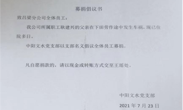 呂梁分公司某員工的父親因車禍住進(jìn)ICU搶救多日,每天開銷巨大。中陽(yáng)文水黨支部經(jīng)過(guò)全體會(huì)議通過(guò)發(fā)起愛心捐款活動(dòng)。