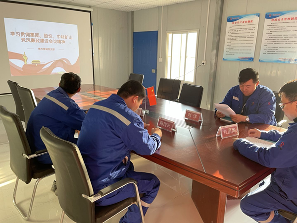 2021年4月9日,焦作晉城黨支部召開全體黨員大會,集中學(xué)習(xí)貫徹落實(shí)2021年中國建材集團(tuán)、中國建材股份、中材礦山黨風(fēng)廉政建設(shè)會議材料,會議由支部書記杜國賓支持,支部全體黨員參加。